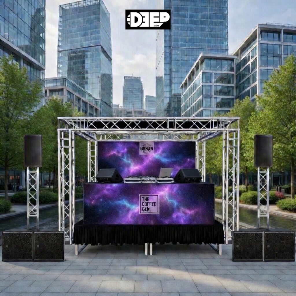 DEEP GROUP › Packages › PRO STAGE SET UPPRO STAGE SET UP packageRaised stage, LED video wall, DJ booth, and a full RCF/JBL PA — one bundle that covers a serious live or DJ event end to end.From £2,000 per dayPRO STAGE SET UP event package from DEEP GROUPAbout this packageA raised stage, a thumping PA, and a full LED video wall — this bundle hands you a complete performance rig in one booking. Built around a truss rectangular prism structure (3.5 m × 3 m × 2.5 m high) with three stage deck sections, it gives your artist or DJ a proper platform to own. The LED video wall and matching LED DJ booth create an instant visual centrepiece, while four RCF subwoofers, two RCF ART 915-A tops, and a pair of JBL EON 610 speakers deliver clean, room-filling sound across large crowds.Everything arrives as one integrated setup — trussing, stage, visuals, and audio — so there's no chasing separate suppliers or hoping kit from different hires plays nicely together. Suited to festivals, warehouse events, corporate showcases, and club nights expecting serious crowds. Book at least 7 days ahead to secure it.Key detailsPackage price£2,000Book PRO STAGE SET UP packageDEEP GROUP delivers, rigs and supervises pro stage set up package hires across London, Essex and the Home Counties. Every piece of kit is fully insured and PAT-tested. Book online for transparent pricing and confirmed availability.Prefer to speak to someone? Contact the DEEP GROUP team or browse the full event hire catalogue.
